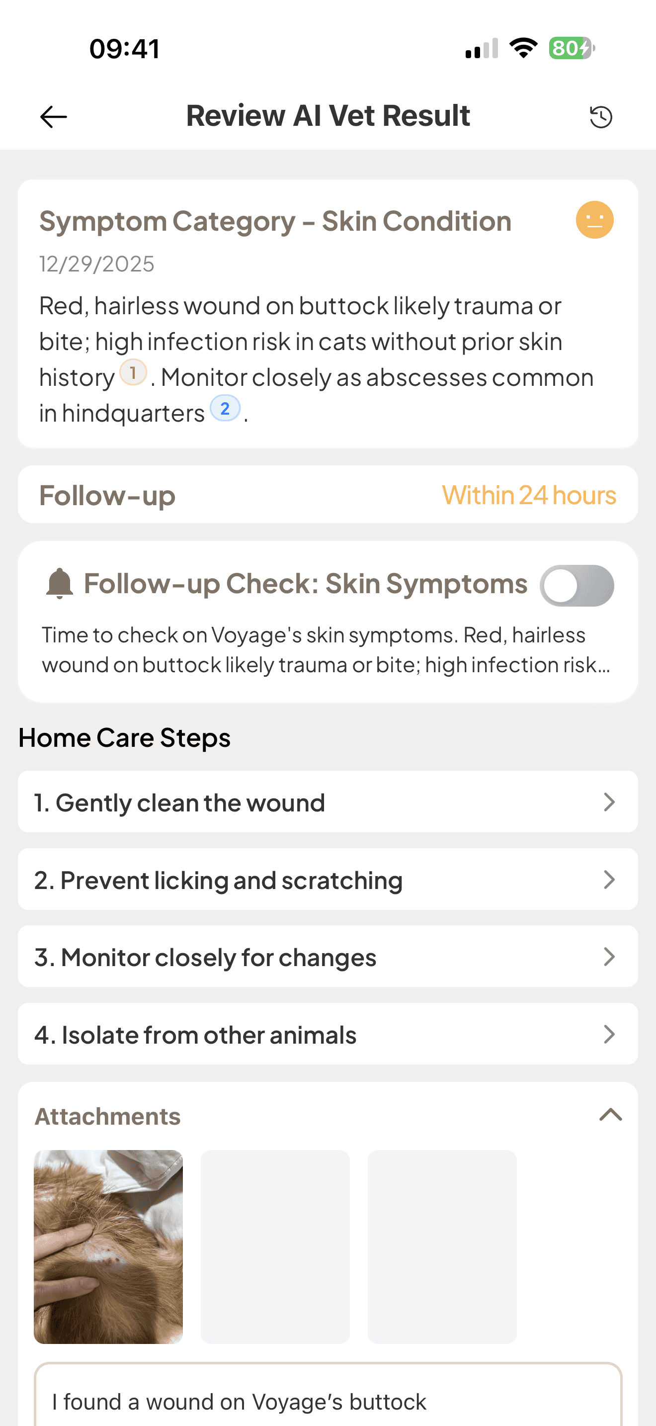 Snap a photo, describe the symptoms - vet-level diagnosis powered by your pet's health records, with home care steps.