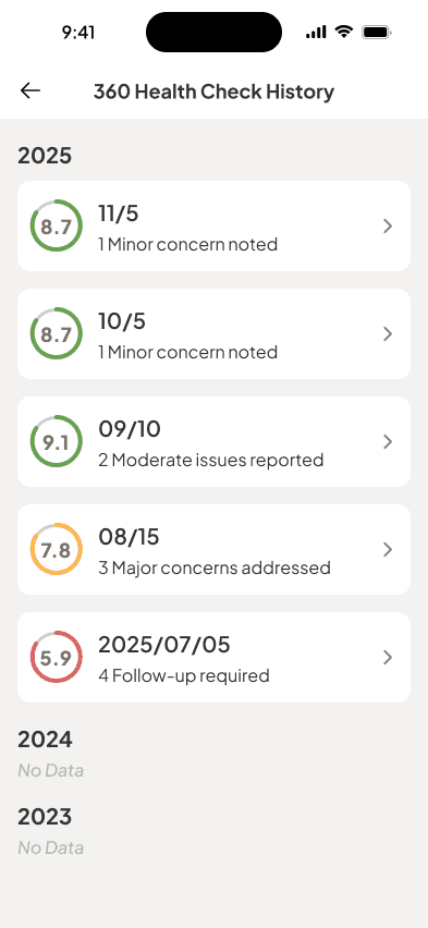 Daily logs, monthly 360° check-ups, symptom tracking — catch issues before they become serious.